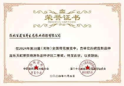 11 07月2024 了解詳情 百蓮百荷參加全國荷展獲全國荷花睡蓮新品種評比二等獎! 第38屆全國荷花展覽于2024年7月4日在江蘇無錫市舉行,來自全國各地的荷花愛好者、園藝師以及企業(yè)代表齊聚一堂,共同見證了這場荷花界的盛世。我公司精心培育的荷花新品種“古樂天虹”與睡蓮新品種“拇指嬌娘”在本次競賽中脫穎而出,榮獲了寶貴的二等獎。