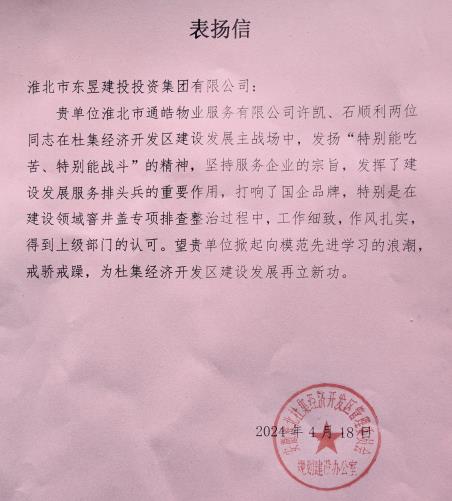 26 04月2024 了解詳情 通皓物業(yè)喜獲杜集區(qū)經(jīng)濟(jì)開發(fā)區(qū)委員會(huì)表揚(yáng)信一封 近日,通皓物業(yè)收到一封來自業(yè)主單位杜集區(qū)經(jīng)濟(jì)開發(fā)區(qū)委員會(huì)的表揚(yáng)信,信中業(yè)主單位對我公司良好的工作作風(fēng)、熱枕的服務(wù)意識(shí)表示高度贊揚(yáng)。